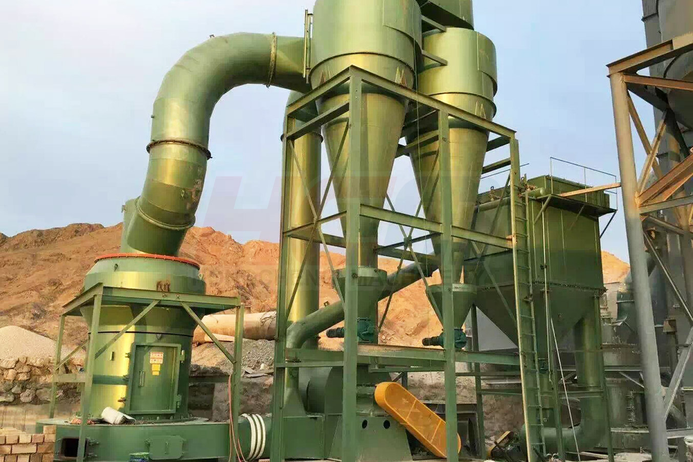 Мельницы серии R состоят из главной мельницы, турбинного классификатора, системы трубопровода, воздуходувки под высоким давлением, циклонного сепаратора, щековой дробилки, электромагнитного вибропитателя, ковшового элеватора и шкафа электронного управления. Главная мельница включает фундамент, кожух, пластины, кольцо, валки, крышку и двигатель. Валки и размольное кольцо выполнены из износостойких материалов.